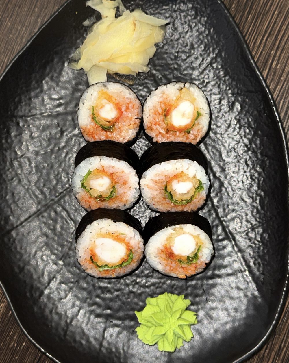 Ролл с тигровой креветкой темпура,листом салата и соусом кимчи