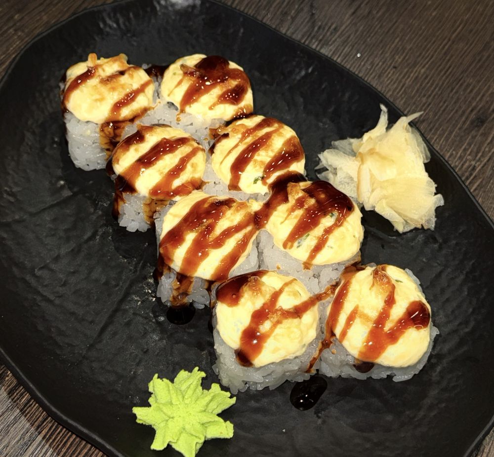 Запеченный ролл с курицей BQQ, творожным сыром,огурцом,соусом сырным и соусом тереяки