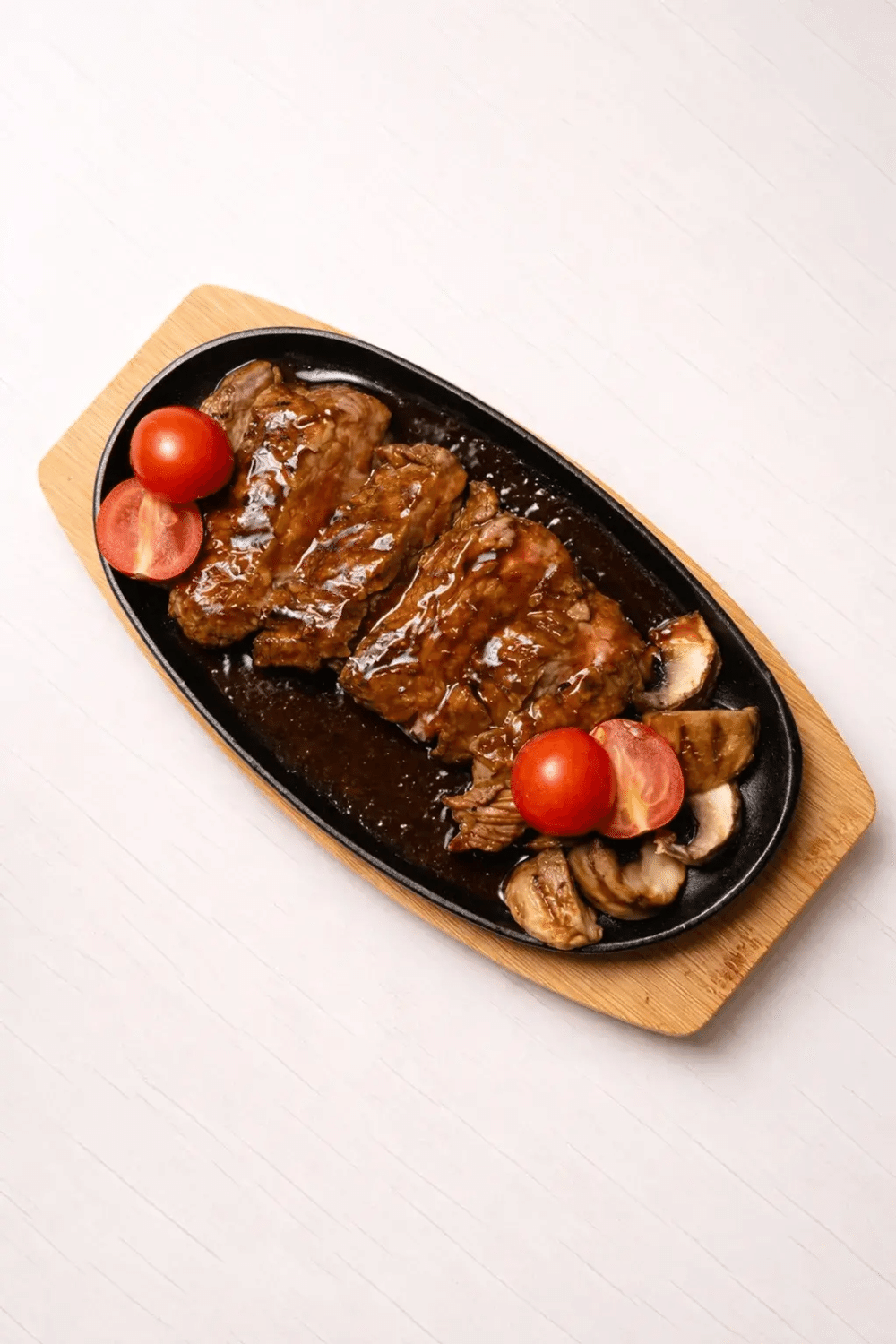говядина в соусе Ланч кинг подается с томатами черри и шампиньонами гриль